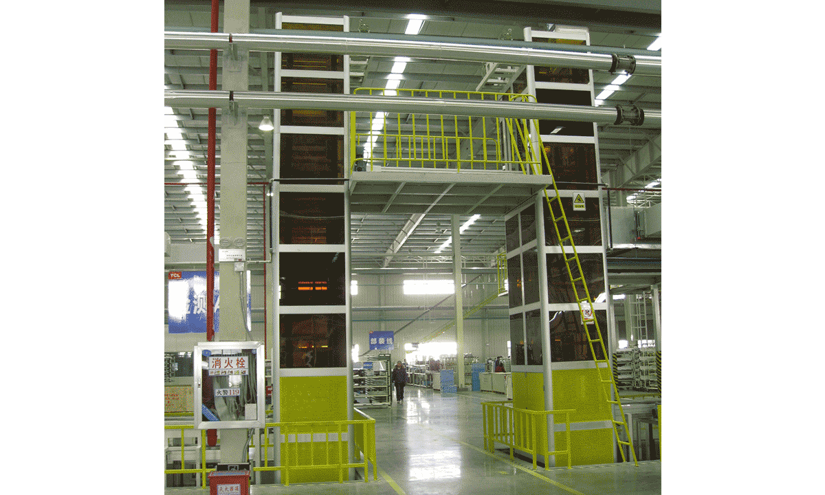 由底盘模组、提升模组、推入模组、推出模组、控制模组构成,主要应用于家电行业,主要用于在垂直上下通道上载运货物升降的平台或半封闭平台的提升机械装置,提升机工作的同时,栈板的回程不占用工作节拍,输送效率高。
