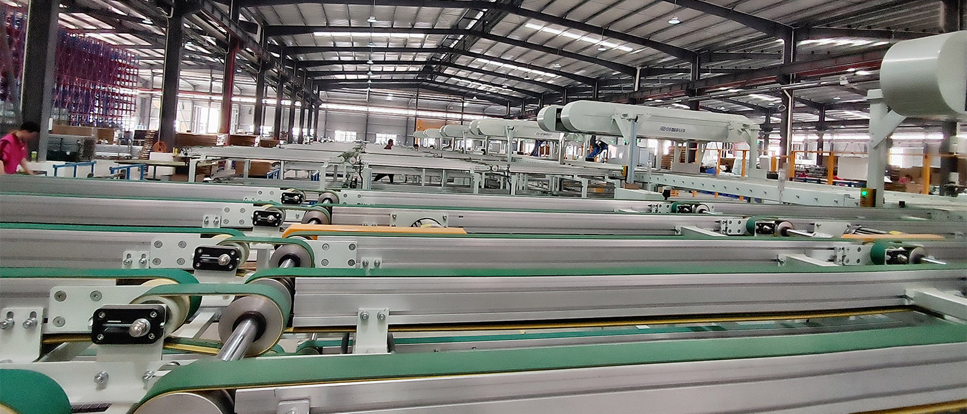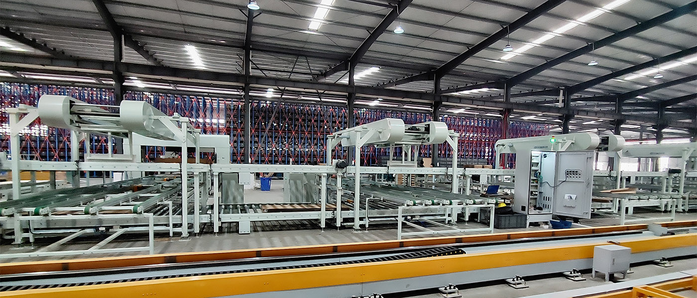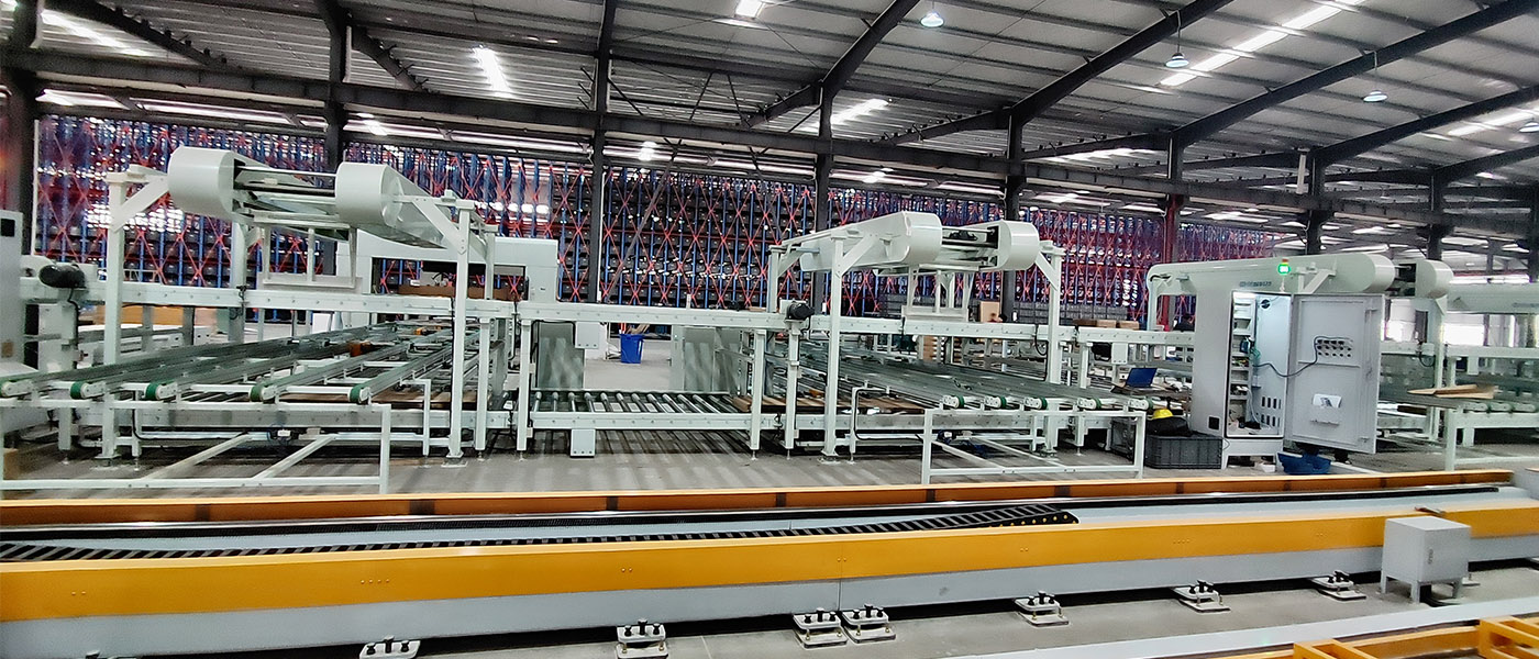 一台堆垛机、2套智能分拣、wcs/wms系统等组成。输送线分为纸箱上线输送机,玻璃上线输送机,成品输送机。