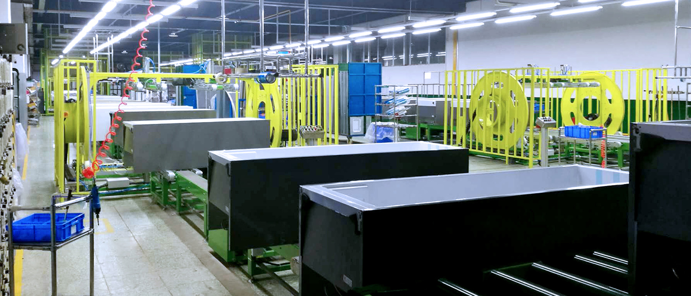 冰箱的门体有对开、上下、大单、品字四种,箱体又分平背式或凸背式,有单门、双门、对开门、十字对开门结构。冰箱生产线一般包括A、门发泡线B、箱发泡线C、产品装配线三大部分。其中,门发与箱发均与生产线配套安装,其装配线一般采用链板线、滚筒线等模式,一般不配工装板。