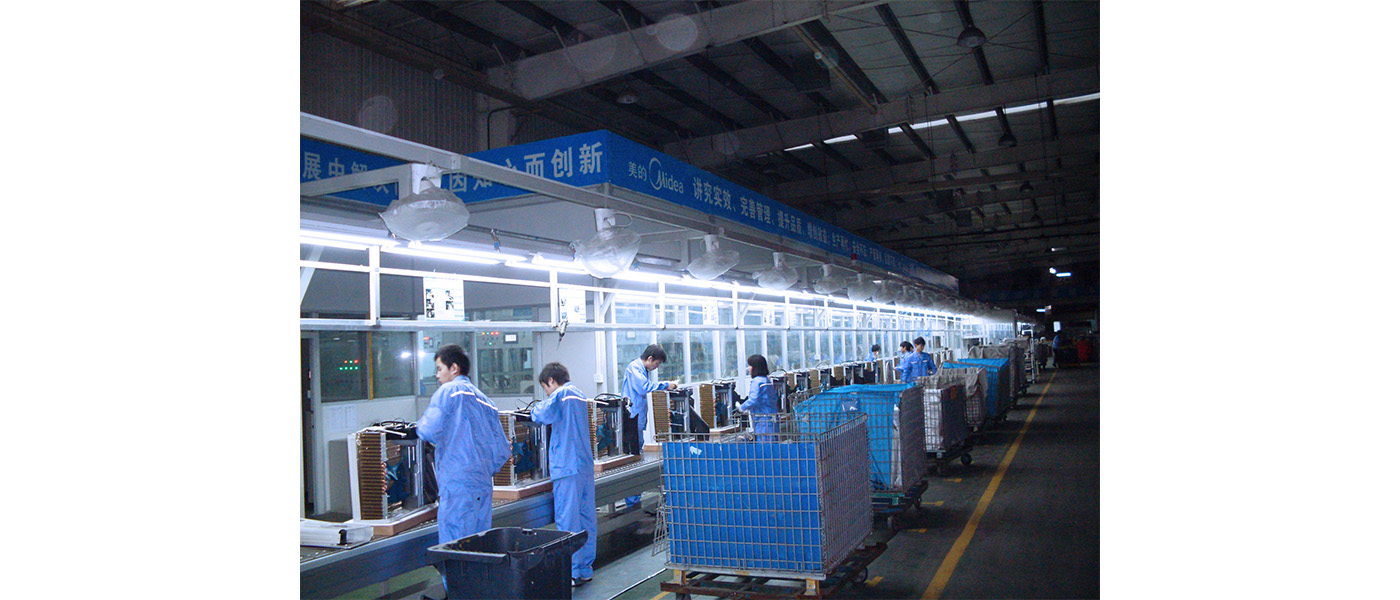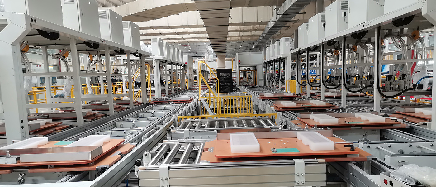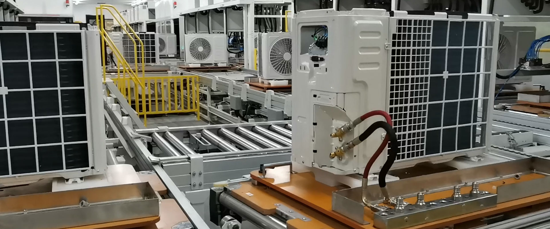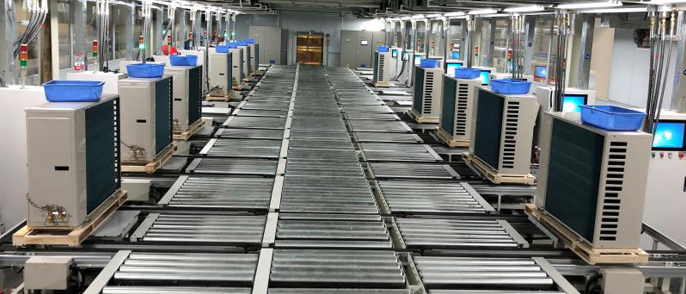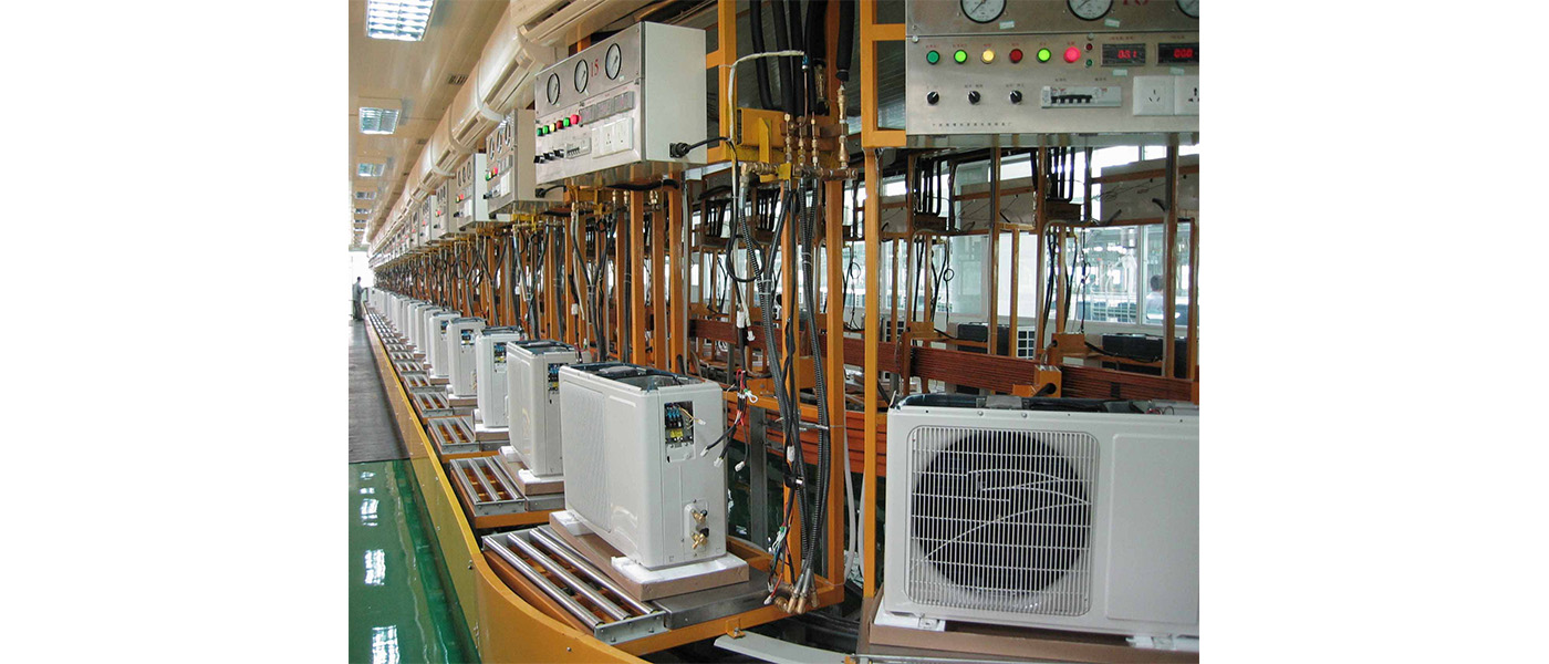 空调生产线主要有柜机和挂机生产线,也包括商用空调、中央空调生产线。其中柜机及挂机生产线一般采用全自动生产线。其他的一般采用半自动或手推生产线。柜机与挂机又分为室内外与室外机生产线,通常也配套使用悬挂线进行物料配送,室内机生产线一般采用工装板式,用倍速链、链板线及滚筒线输送。包括以下部门:组装段、电性能检测段、包装段。